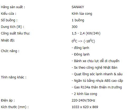 Tủ đông Sanaky VH-3899K dàn lạnh đồng là sản phẩm tủ đông cỡ nhỏ trong dòng sản phẩm tủ đông một ngăn có nắp kính trưng bày. Dung tích thiết kế 300 lít với một ngăn làm đông rộng, sâu các thông số chiều dài: 1.033m, chiều rộng: 0.62m, chiều cao: 0.869m. Tủ đông Sanaky VH-3899K rất phù hợp với các siêu thị mini, các cửa hàng có diện tích nhỏ vừa phục vụ cất trữ đông lạnh sản phẩm vừa trưng bày sản phẩm để khách hàng dễ dàng quan sát.