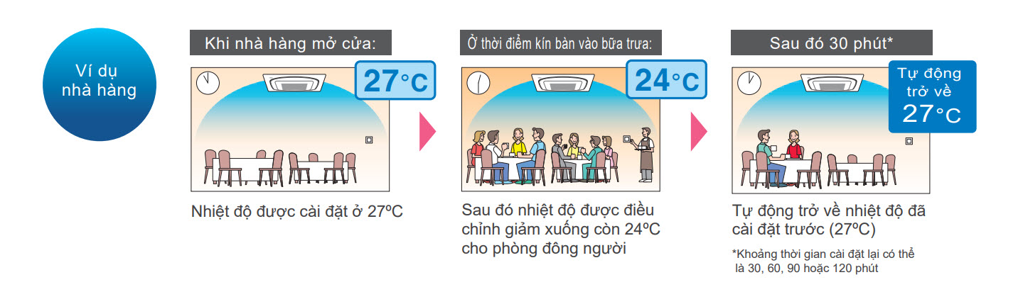 - Ngay cả khi nhiệt độ cài đặt thay đổi, sau thời gian cài đặt tự động, nhiệt độ mới sẽ trở về lại giá trị đã cài đặt trước đó.