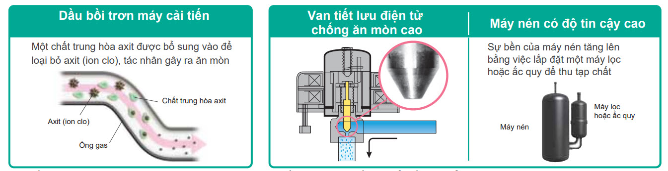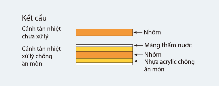 Để nâng cao độ bền bằng cách cải thiện khả năng chịu đựng ăn mòn do muối và ô nhiễm không khí, dàn trao đổi nhiệt được xử lý chống ăn mòn (đã được xử lý sơ bộ bằng acryl) được sử dụng cho dàn trao đổi nhiệt tại dàn nóng