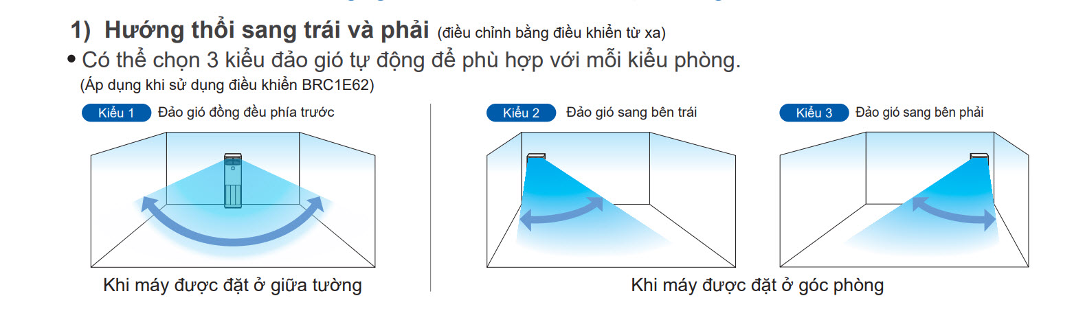 Có thể chọn 3 kiểu đảo gió tự động để phù hợp với mỗi kiểu phòng