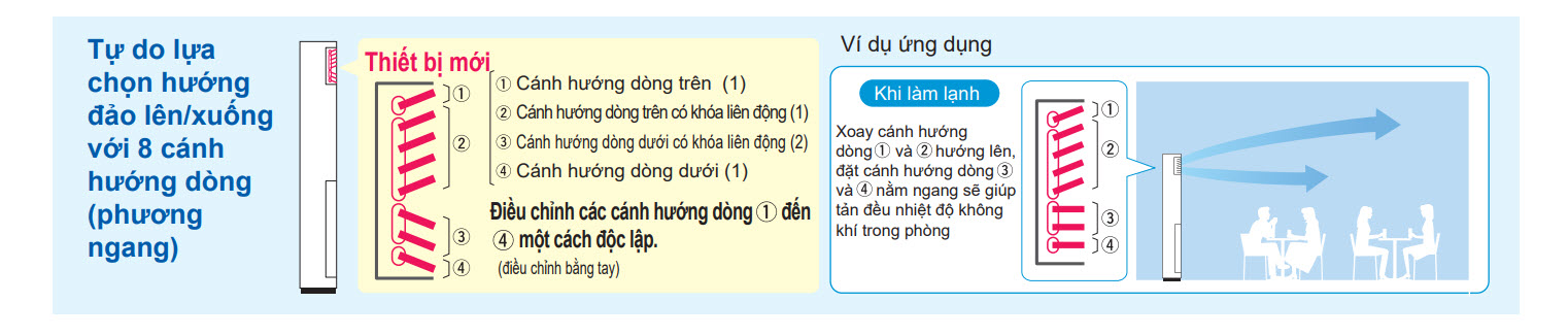 Hướng thổi lên xuống: Đảo gió lên xuống độc lập nhanh chóng phân bổ nhiệt độ đồng đều trong phòng, giúp tiết kiệm điện năng